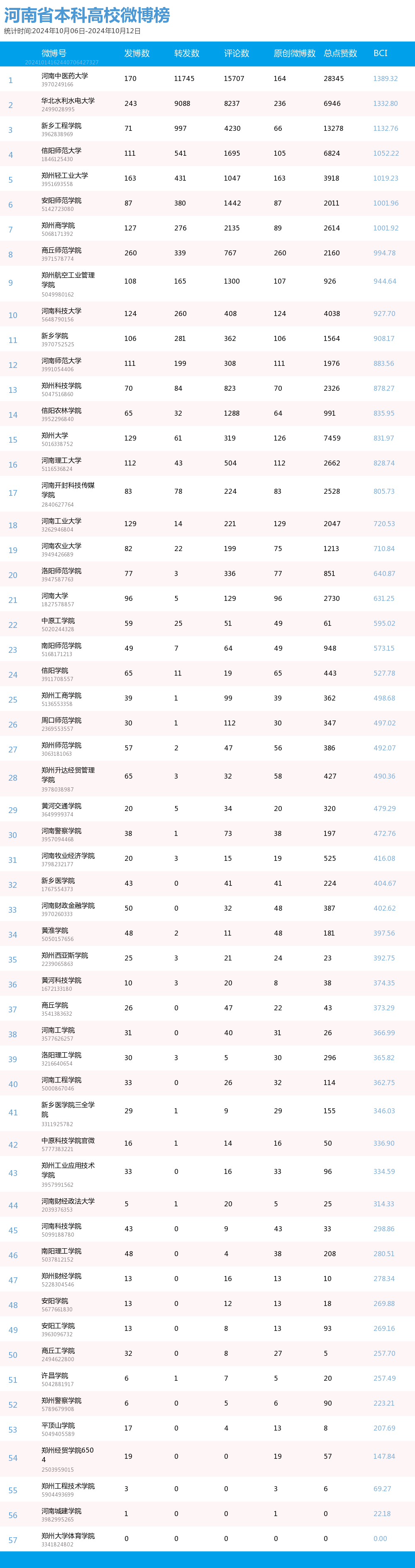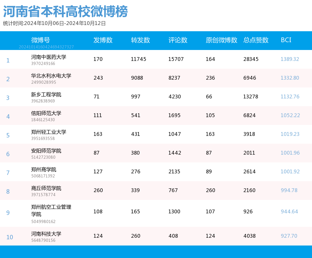 河南省本科院校官方微博BCI