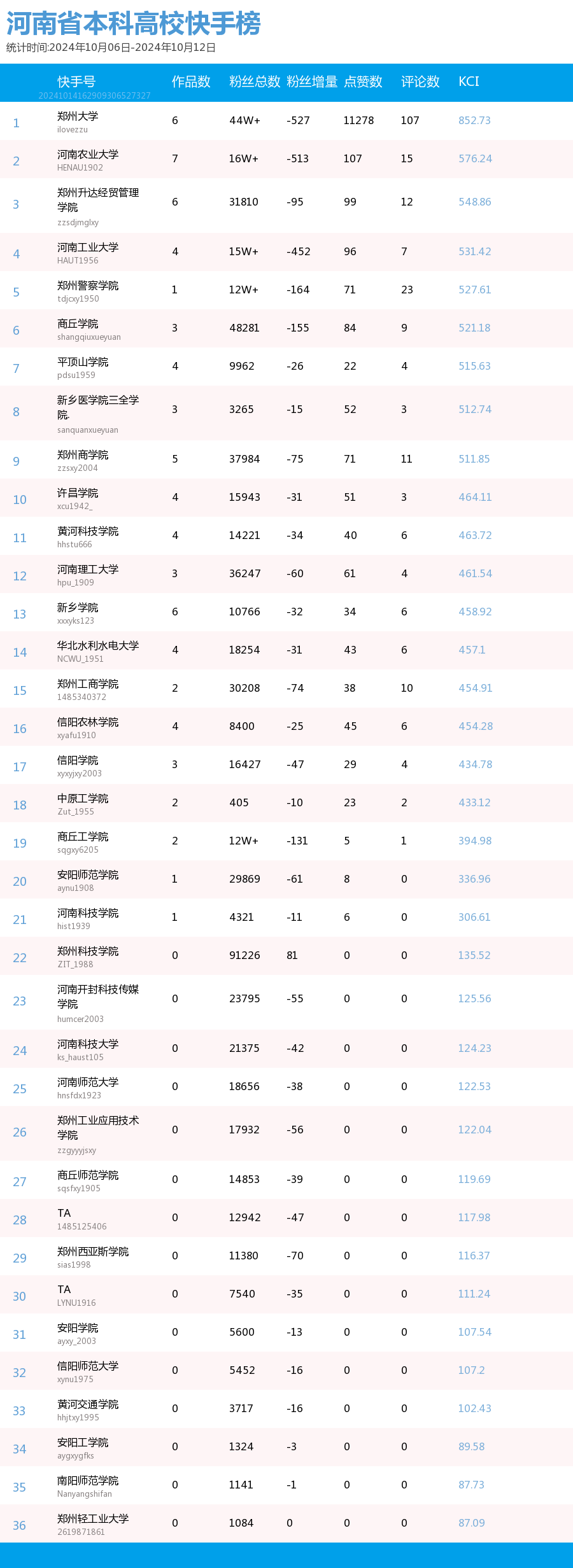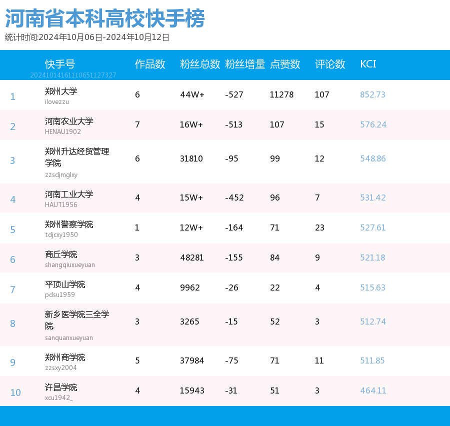 河南省教育新媒体暨舆情研究中心采用第三方平台(清博指数)监测到的数据,按类别对10月6日-10月12日河南省本科院校微信、微博、抖音、快手综合传播力进行排名并整理发布。