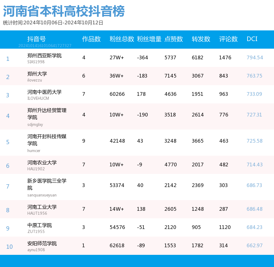 河南本科院校官方抖音DCI TOP10