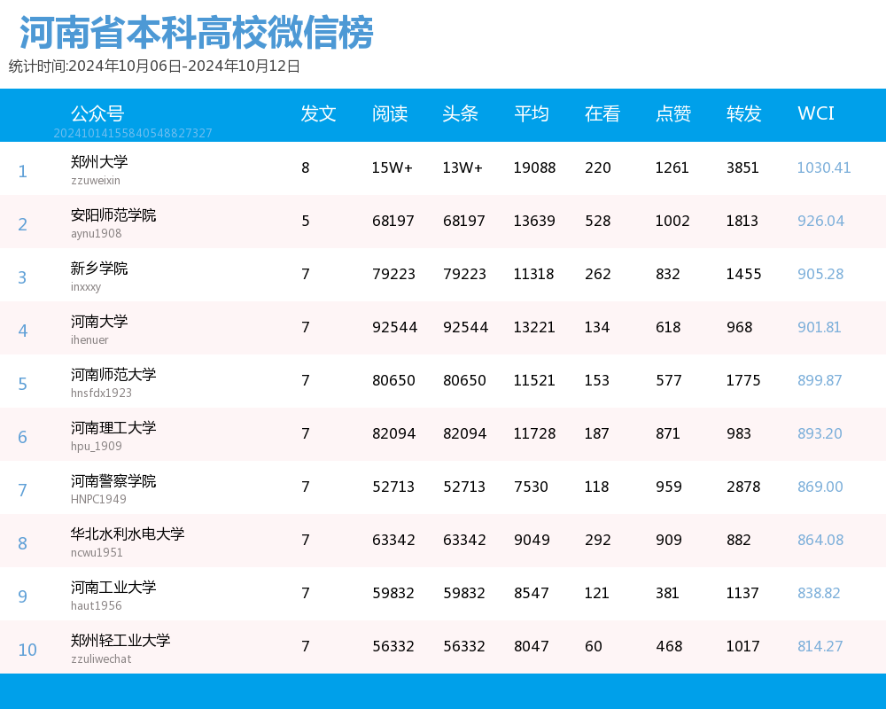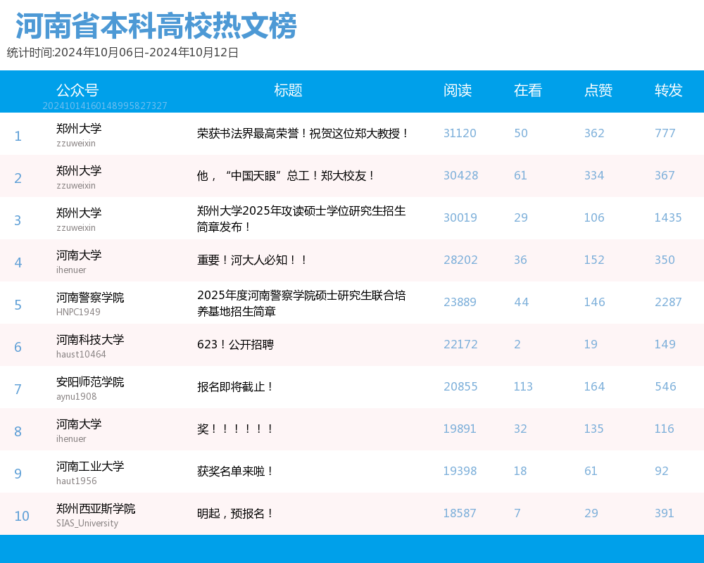 河南省本科院校官方微信热文 TOP10