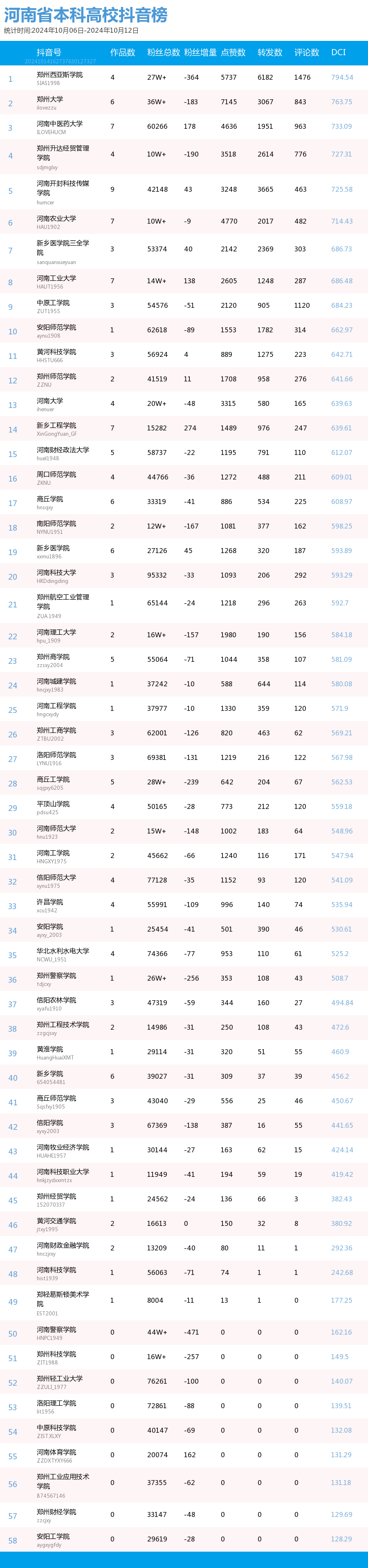 河南省本科院校官方抖音DCI 总榜